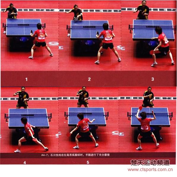 图A1-7中,沈燕飞利用劈长,迫使石川佳纯采用高吊弧圈求的方式处理来球。而在图A9中,沈燕飞看到对方拉球的旋转很强后,选择了下降前期击球。这时来球的速度和旋转已经开始减弱,既容易控制,也能够借上一部分来求的旋转和力量。